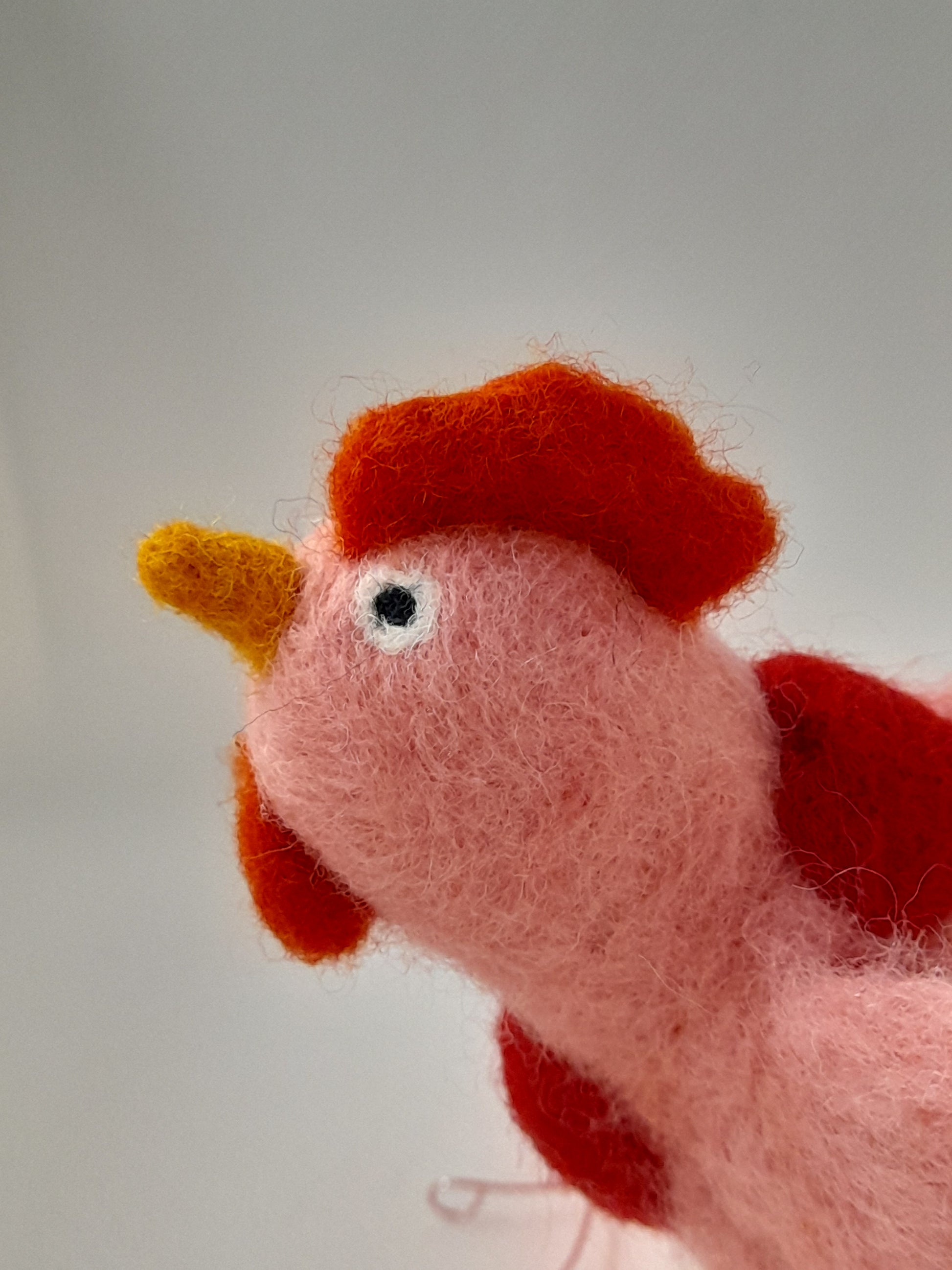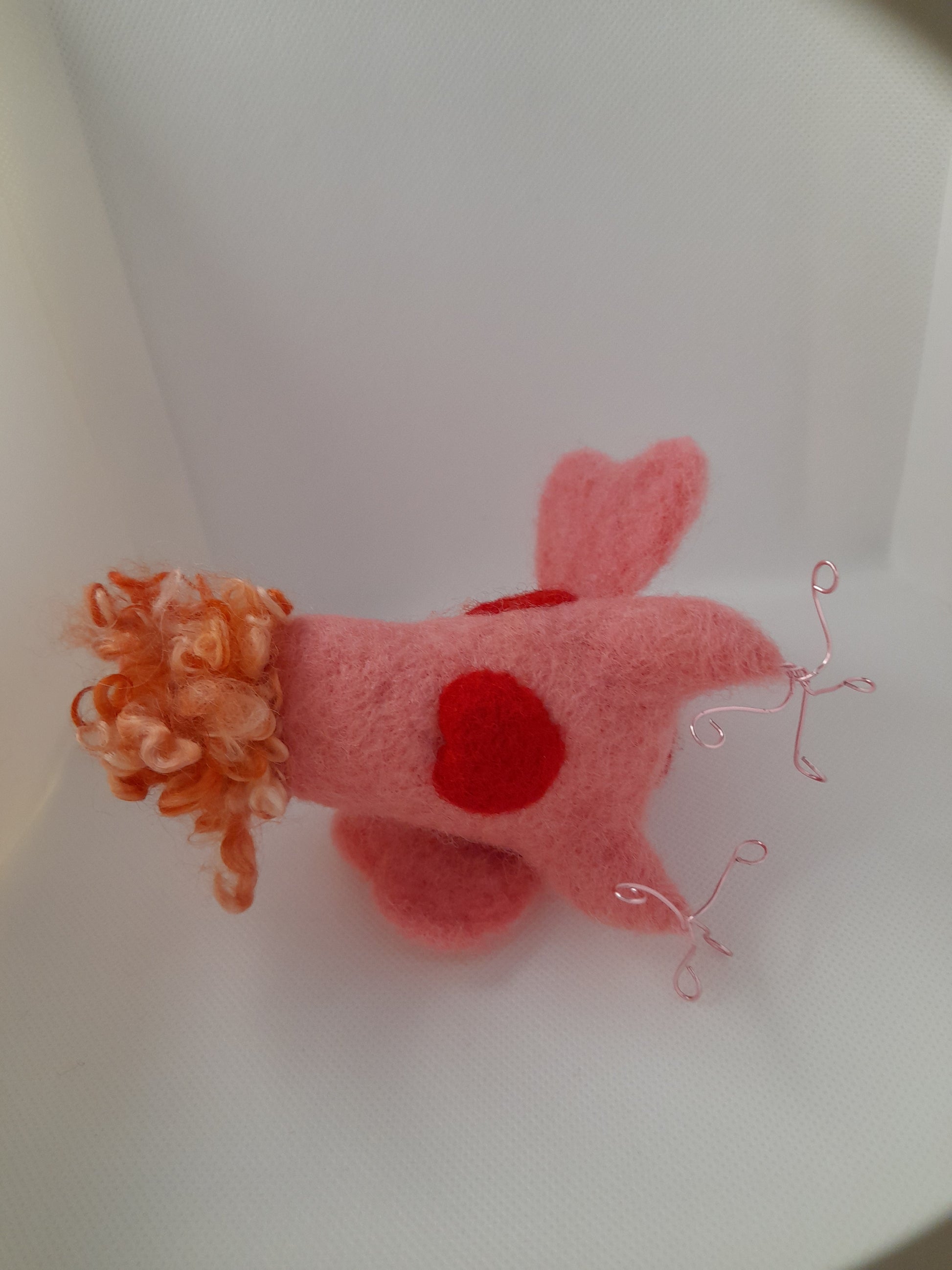 Made from 100% merino wool with wire legs and angora goat locks tail feathers.