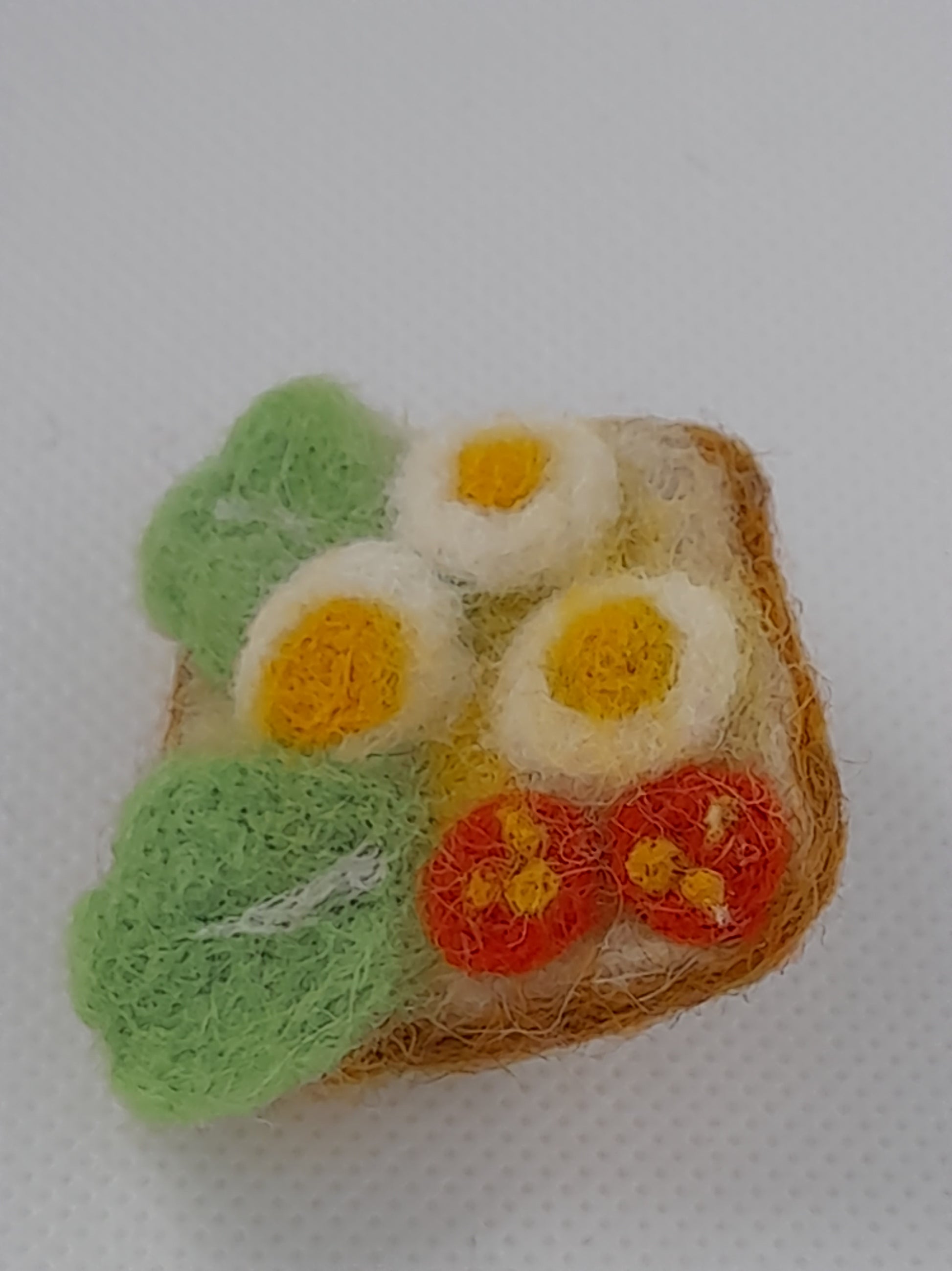 This is a handmade needle felted brooch of an open salad sandwich.Made using merino wool in green ,white,yellow,red beige 100% wool.It has a safety catch on the back .It is 3.5cms wide and 4 cms long.